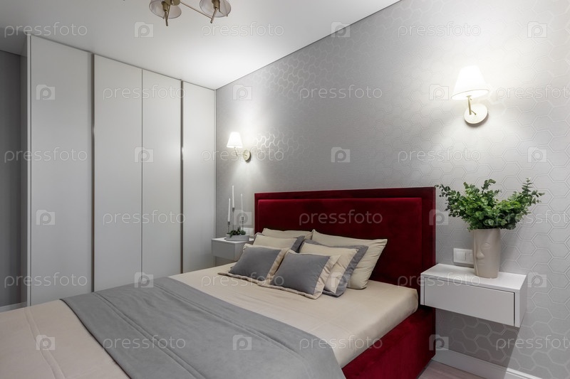 Современная спальня с кроватью с бордовым изголовьем и прикроватными тумбочками