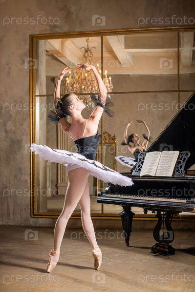 Молодая балерина в белой пачке танцует на красивом старом рояле в винтажном интерьере