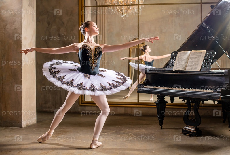 Молодая балерина в белой пачке танцует на красивом старом рояле в винтажном интерьере