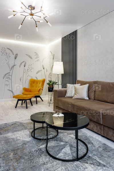 Современный дизайн интерьера гостиной с горчичным стулом, торшером и личными аксессуарами