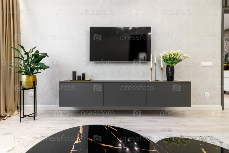 Дизайн интерьера уютной гостиной с телевизором, креслом, журнальным столиком и цветами в вазе
