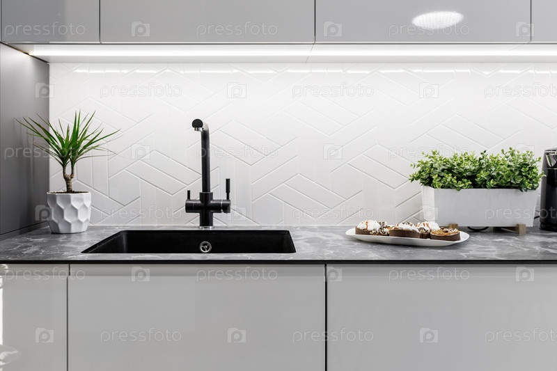 Черная кухонная раковина и водопроводная вода на кухне. Интерьер кухонного помещения квартиры. Встроенная техника. Кухонный прибор. Бытовая техника