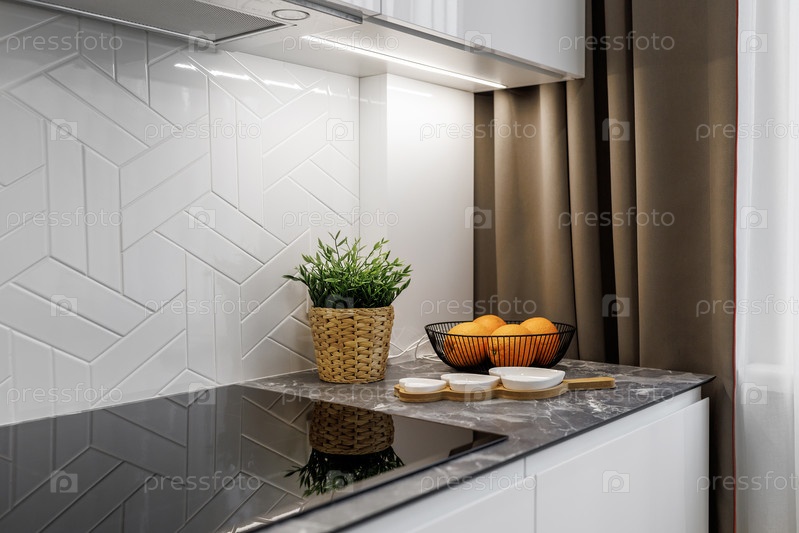 Фрагмент декора современной хни с апельсинами, посудой и цветком, стоящим на столе у окна. Малая глубина резкости