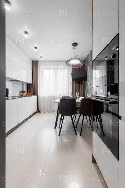 Современная кухня в черном цвете в обеденном столе и кухонной технике