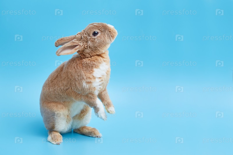 Поздравительная пасхальная открытка с милым кроликом и местом для текста или продукта. Декоративный карликовый кролик рекс на синем фоне