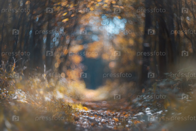 Осенний размытый фон боке. Путь в красивом осеннем лесу