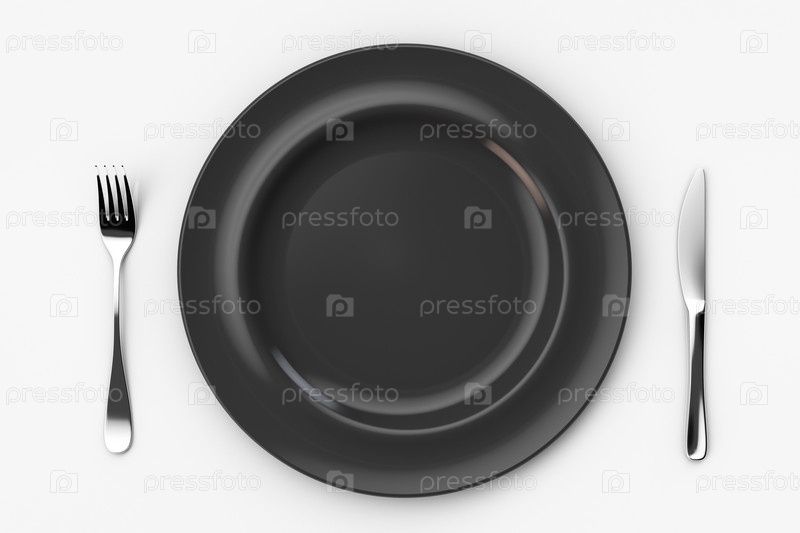 Пустая черная тарелка. Нож справа и вилка слева. Вид сверху