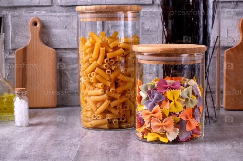 Хранение макарон трех видов в стеклянных банках у серой кирпичной стены. Хранение продуктов в кладовой. Кухонная утварь вокруг