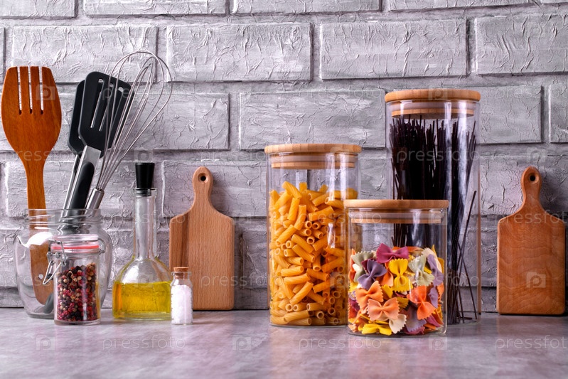 Хранение макарон трех видов в стеклянных банках у серой кирпичной стены. Хранение продуктов в кладовой. Кухонная утварь вокруг