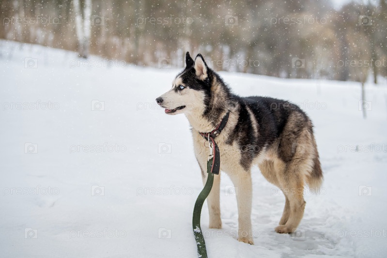Портрет собаки хаски. Сибирский хаски с голубыми глазами в зимнем снежном парке или лесу