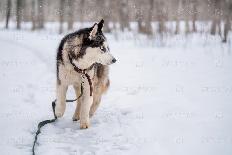 Портрет собаки хаски. Сибирский хаски с голубыми глазами в зимнем снежном парке