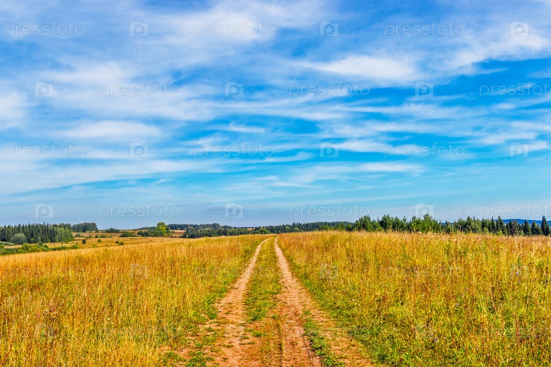 Грунтовая дорога на холме на лугах в солнечный летний день