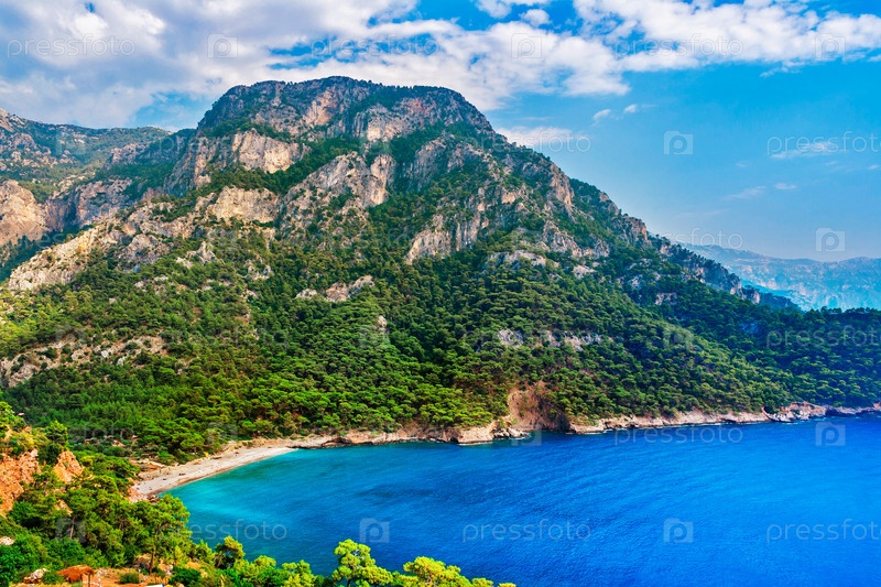 Голубая бухта среди скалистых гор в летний день