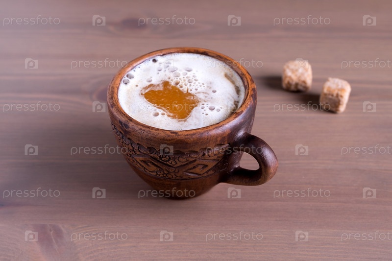 Кофе с молоком в обожженной глиняной кружке с кусочками тростникового сахара