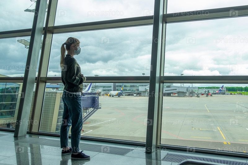 Блондинка в аэропорту смотрит в окно на взлетную площадку у самолетов