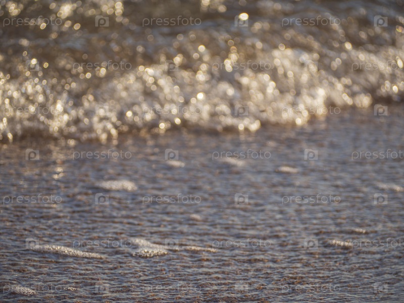Теплая морская вода. Абстрактный пляжный фон. размытый свет боке спокойного моря и кромки воды. Сосредоточьтесь на переднем плане мокрого песка