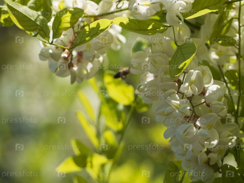 Естественный весенний цветочный размытый фон. Естественная рамка несфокусированных белых цветков акации и зеленых листьев в солнечном свете