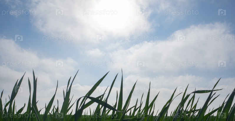 Крупный план зеленой травы на фоне голубого неба с белыми облаками