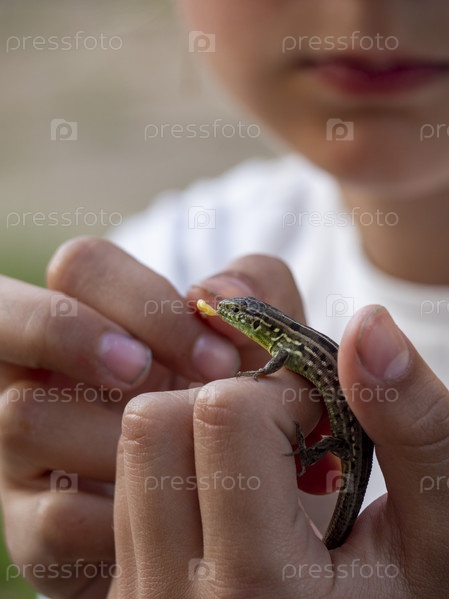 Девочка кормит на руках маленькую ящерицу. Забота о животных