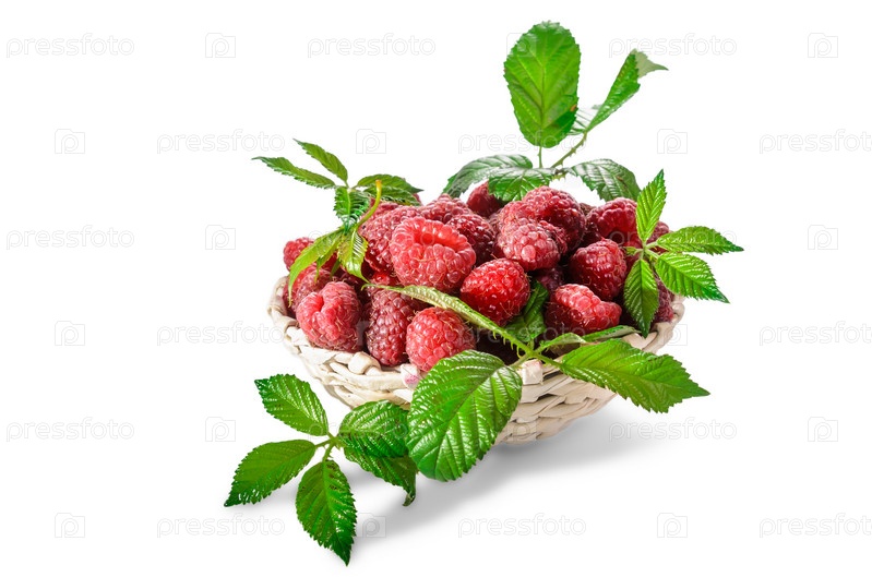 Спелая малина с листьями на белом фоне с мягкой тенью