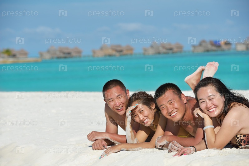 Группа счастливых молодых людей отдыхает на пляже