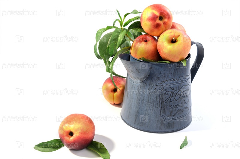 Нектарины в металлическом кувшине на белом фоне с мягкой тенью