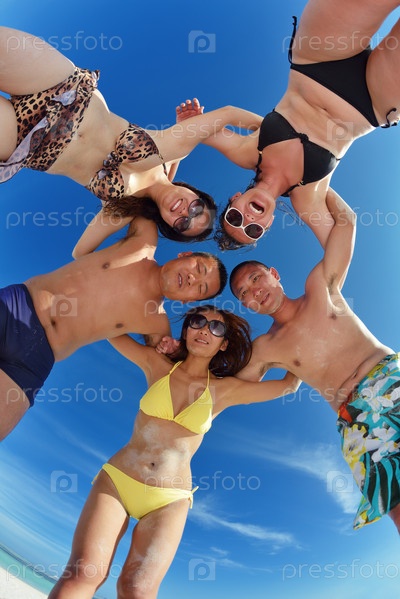 Группа счастливых молодых людей отдыхает на пляже