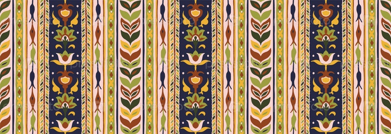Геометрический дамасский орнамент. Икат границы. Этническая вышивка с листьями и монограммами. Племенная векторная текстура. Бесшовный народный узор в ацтекском стиле. Индийский, скандинавский, цыганский, мексиканский, африканский ковер