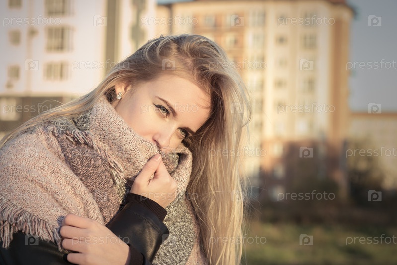 Грустная задумчивая блондинка в тонированном шарфе