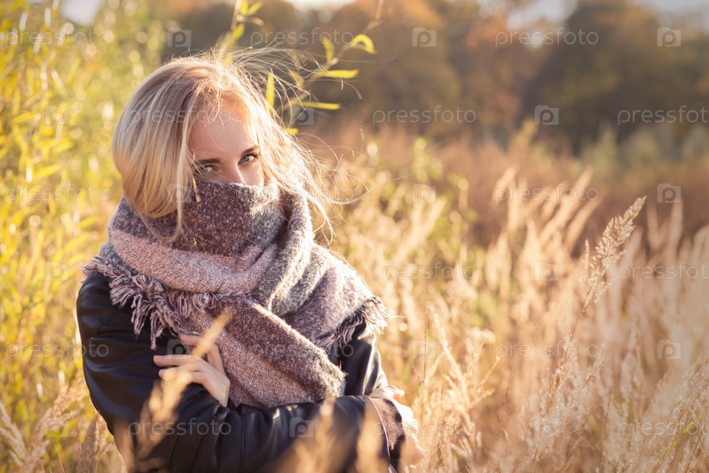 Грустная красивая женщина в шарфе на осеннем закате, тонированное изображение
