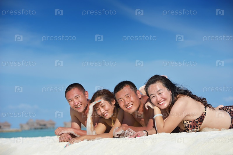 Группа счастливых молодых людей отдыхает на пляже