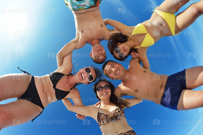 Группа счастливых молодых людей отдыхает на пляже
