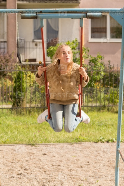 Девушка качается на детской площадке