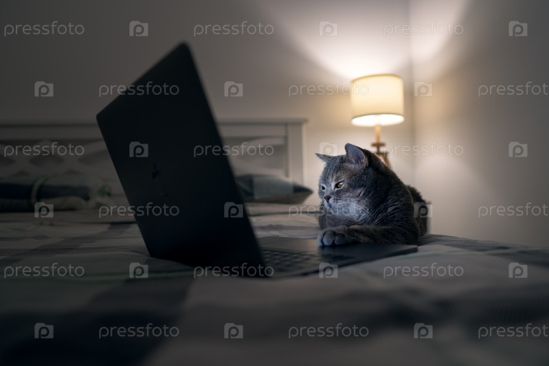 Шотландский кот отдыхает с ноутбуком