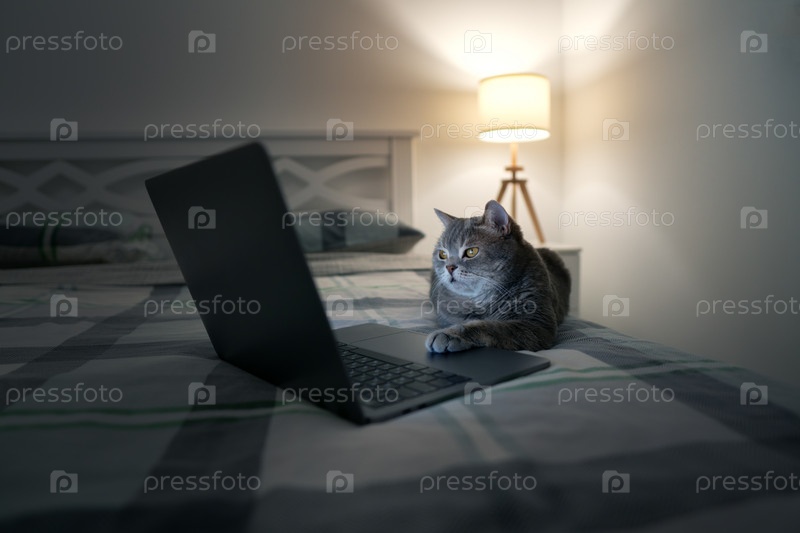 Шотландский кот отдыхает с ноутбуком