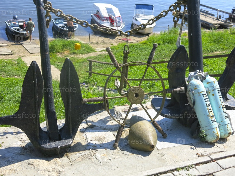 Сельский причал на реке: лодочки и катера у пристани, металлический памятник в виде якорей, водолазных баллонов и штурвала