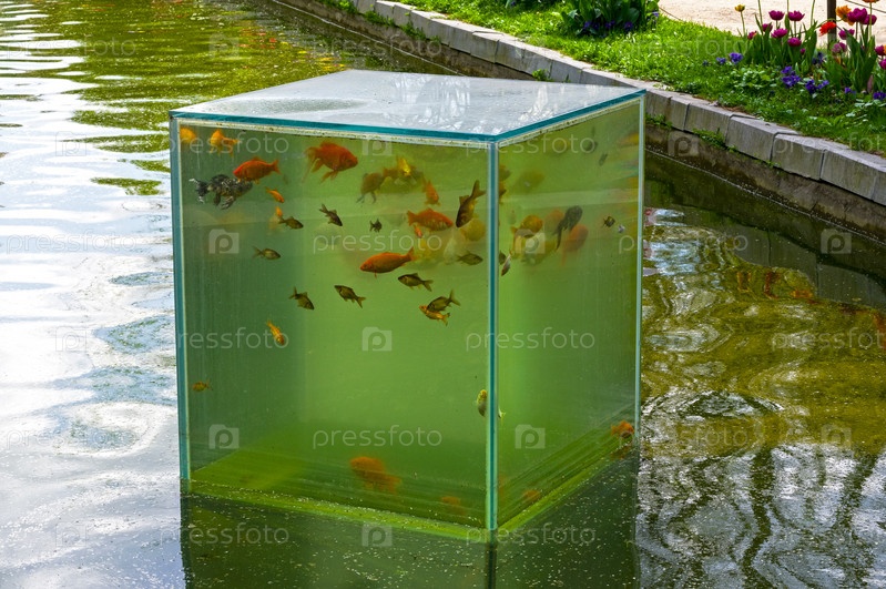 Необычный аквариум - лишенный дна стеклянный куб на поверхности пруда. Аптекарский Огород (филиал ботанического сада МГУ). Москва. Солнечный день в середине мая