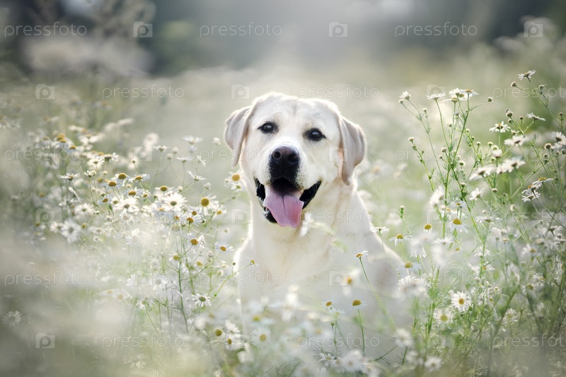 Лабрадор собака. Поле ромашек