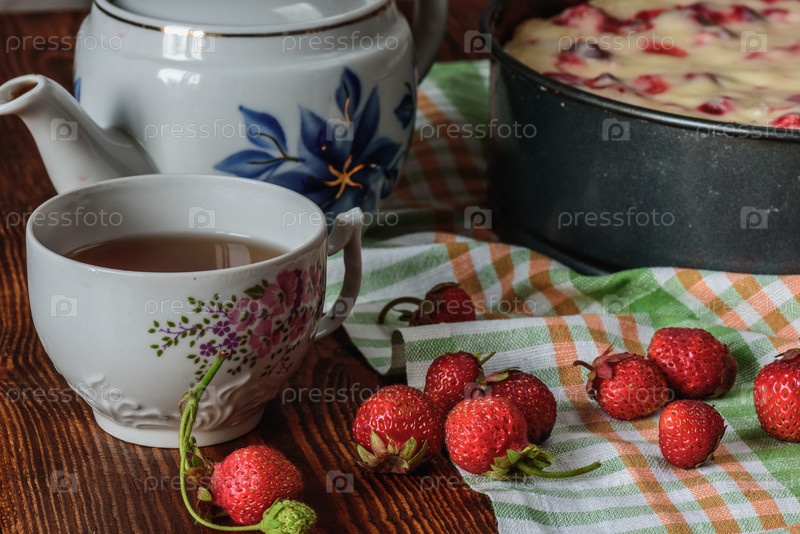 Завтрак с клубничным пирогом, черным чаем и ягодами