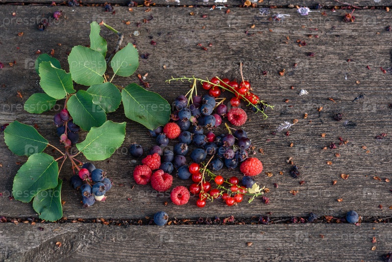 Спелая ирга, красная смородина, малина с веткой, разбросанной по деревянному столу