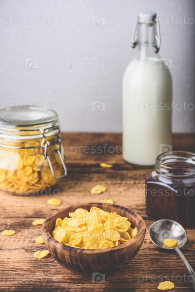 Завтрак с кукурузными хлопьями, молоком и джемом