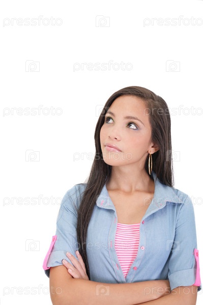 Задумчива и обеспокоенная женщина смотрит вверх, изолированная на белом фоне