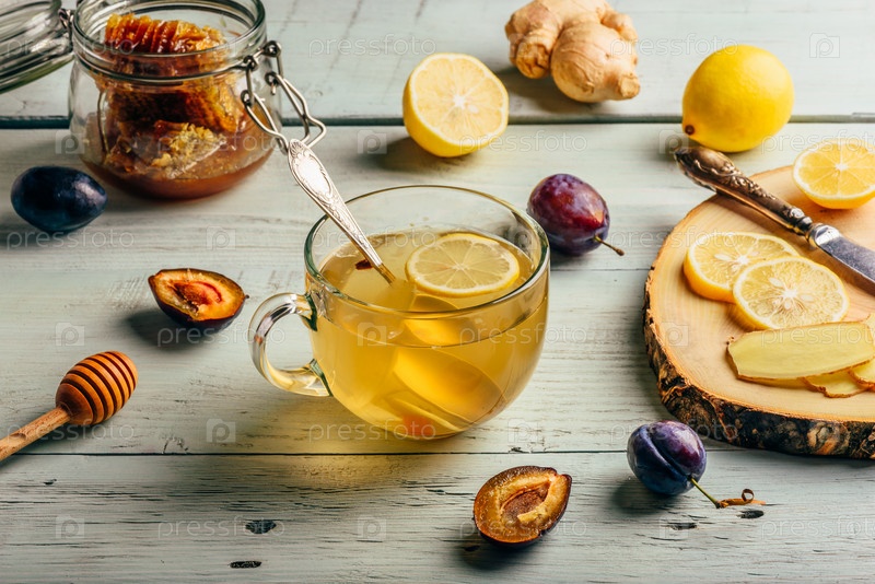Чашка чая с лимоном, медом и имбирем