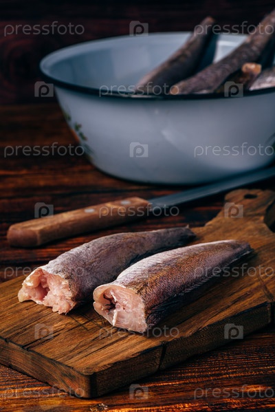 Тушки хека на разделочной доске
