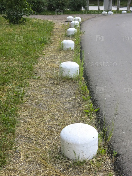 Дорожное ограждение в виде белых бетонных столбов вдоль асфальтированной дороги
