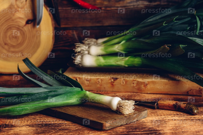 Свежий зеленый лук-порей на разделочной доске