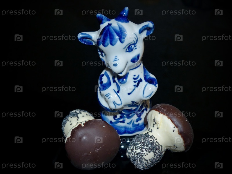 Коза и шоколадные грибы. Лакомство для маленьких и взрослых сладкоежек. Коза в традиционном русском гжельском стиле. Гжель - русский народный промысел по изготовлению керамики и фарфора