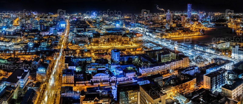Панорамный вид из Екатеринбурга на ночной дом Высоцкого