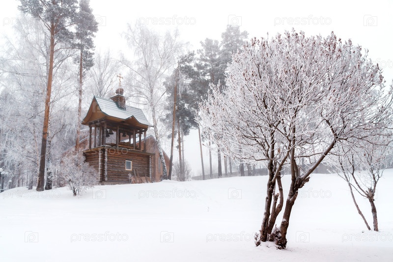 Колокольня Храм во имя Пресвятой Богородицы в зимнем тумане одноименная гора рассвет 2