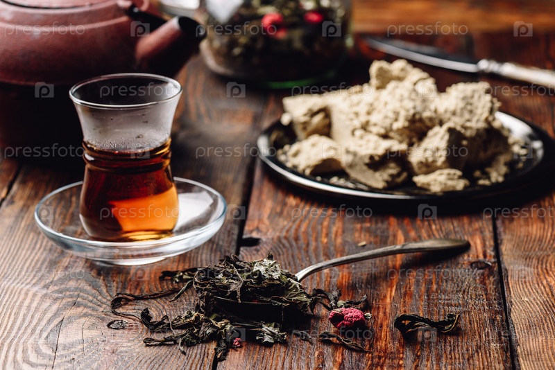 Ложка малинового травяного чая и готовый чай в стакане армуду